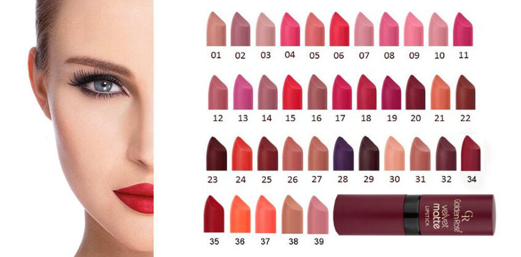 رژ لب جامد گلدن رز مدل Velvet Matte، تمام ویژگی های یک رژ لب مات را دارد. این رژ لب دارای غلظت رنگ بالا است که بعد از استفاده کردن جلوه ای مخملی به لب هایتان می بخشد. این رژ لب با ویتامین E ترکیب شده تا باعث چروک شدن پوست لب نشود و از آن در برابر آسیب های خارجی محافظت می کند. برخلاف خیلی از رژ لب های مات این محصول لب های شما را آبرسانی می کند و به هیچ عنوان پوست لبتان خشک نمی شود